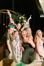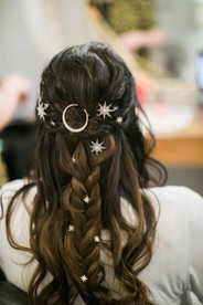 The venue really helped Kate pull in some of her favorite pieces for the wedding. The whimsical feel allowed her to bring in moon and star accents along with twinkle lights and a soft candle glow. The bride talked with Romance and Rust to bring in the decor, linens, florals, and special touches that would fit right in. Our bride's Reu De Seine Cactus Rose Dress was filled with colors and details from the cut out couture to the flowy flared sleeves, while our groom stunned in a custom gold patterned suit from viva Las Vegas.